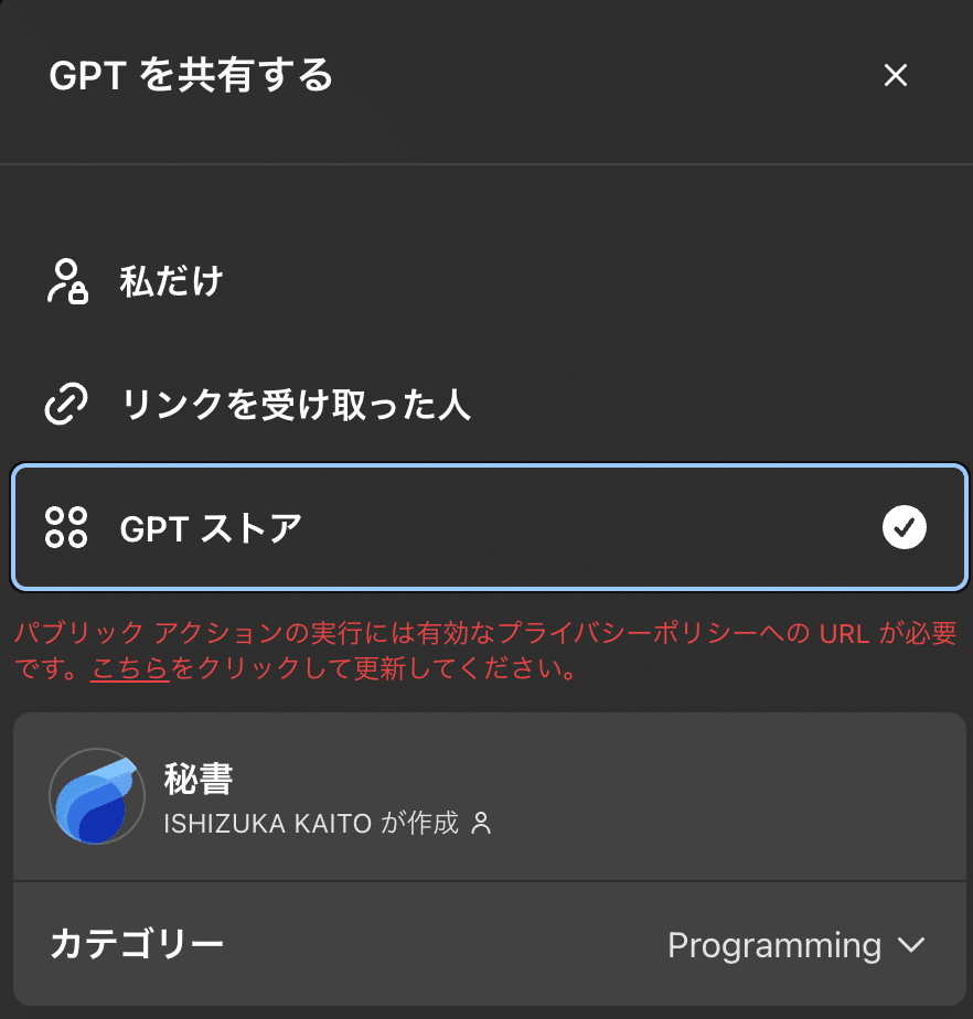 **「自分だけが使う」「リンクでGPTsを共有した人に使ってもらう」「GPTストアに公開する」**の3択から公開範囲を選択できます