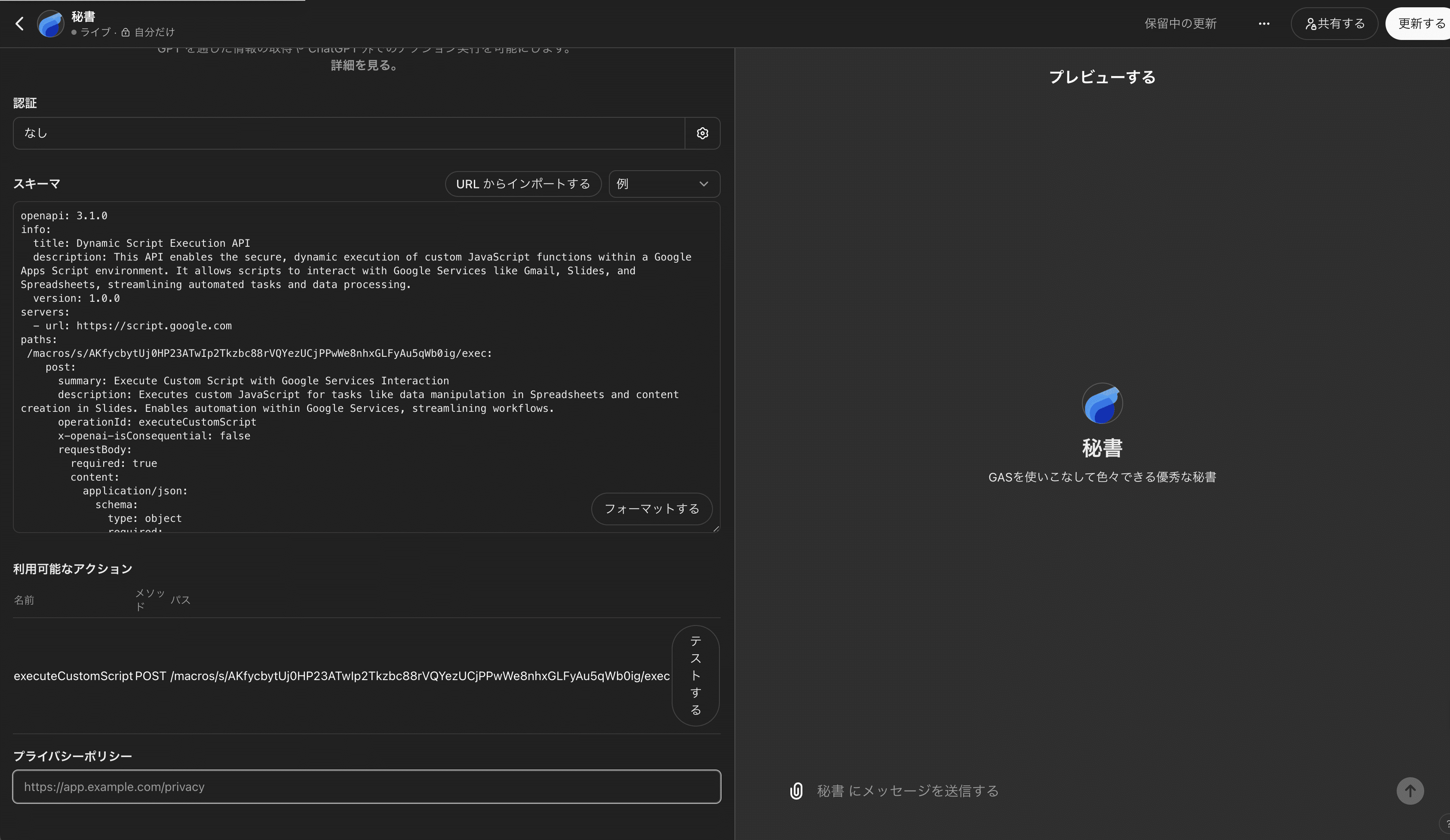GPTs作成画面の左下「プライバシーポリシー」の欄に